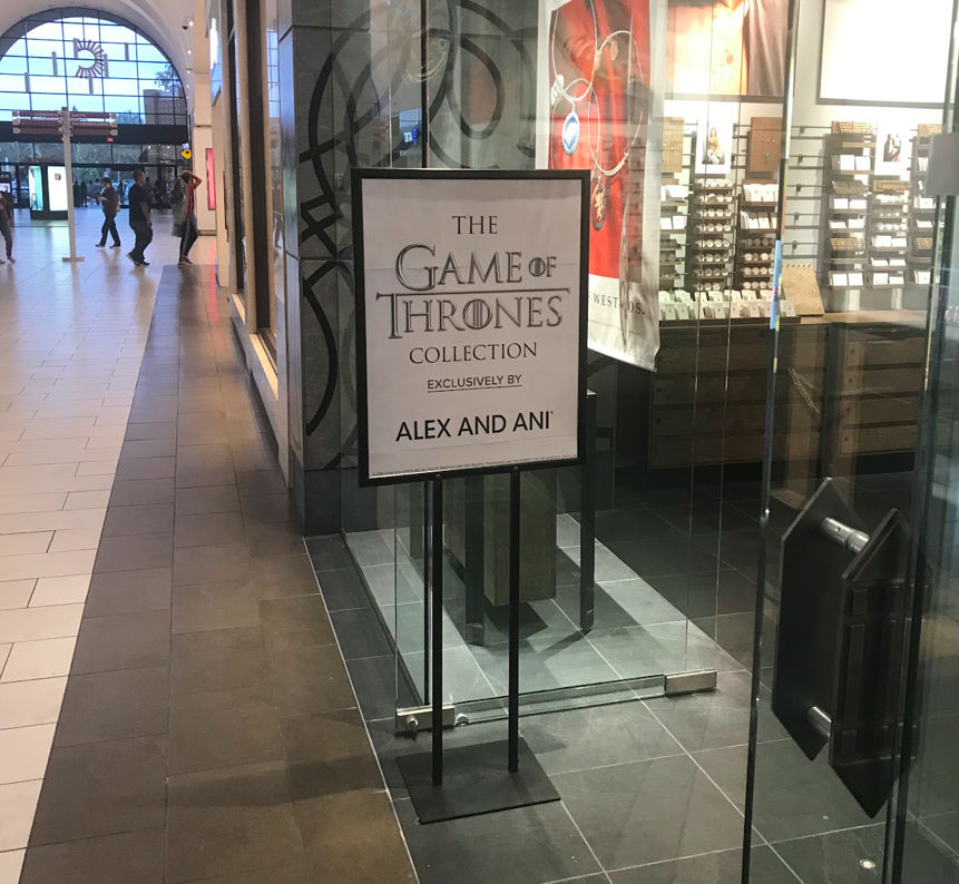 The jewelry retailer Alex and Ani capitalized on GOT by having a special jewelry line for the show. And to promote it in-store, Alex and Ani set-up a GOT-themed window display plus outdoor signage inviting people to check out the products.