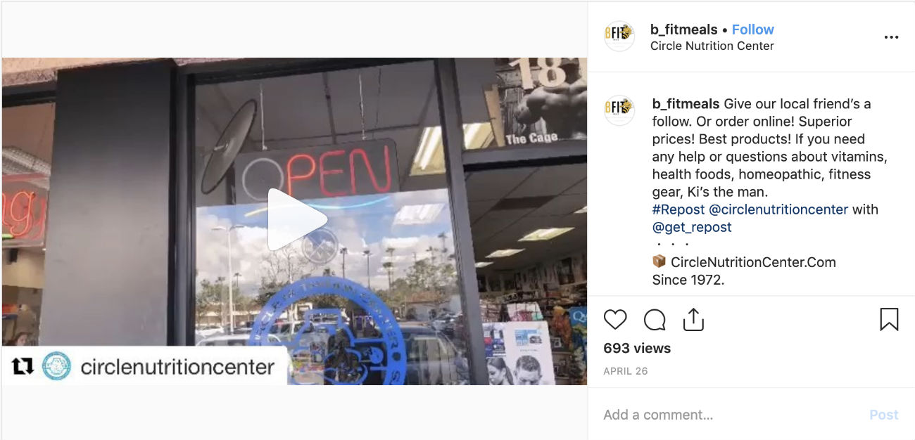 Or you could keep things easy by simply mentioning each other on social media. Check out this example, in which B Fit Meals, a healthy planning service, gave a shout-out to Circle Nutrition Center (another local business) on Instagram: