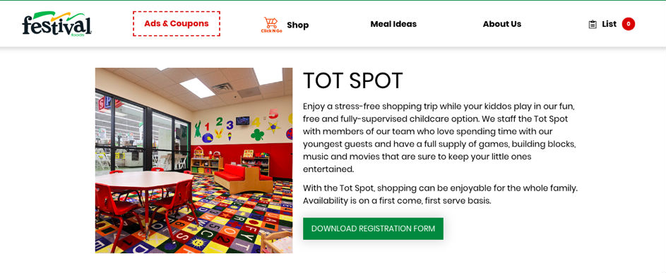One retailer that does this, according to Tuschl, is Festival Foods in Wisconsin. “It created a tot spot: a place where moms can shop while the kids play with a free babysitter on-site,” she shares.