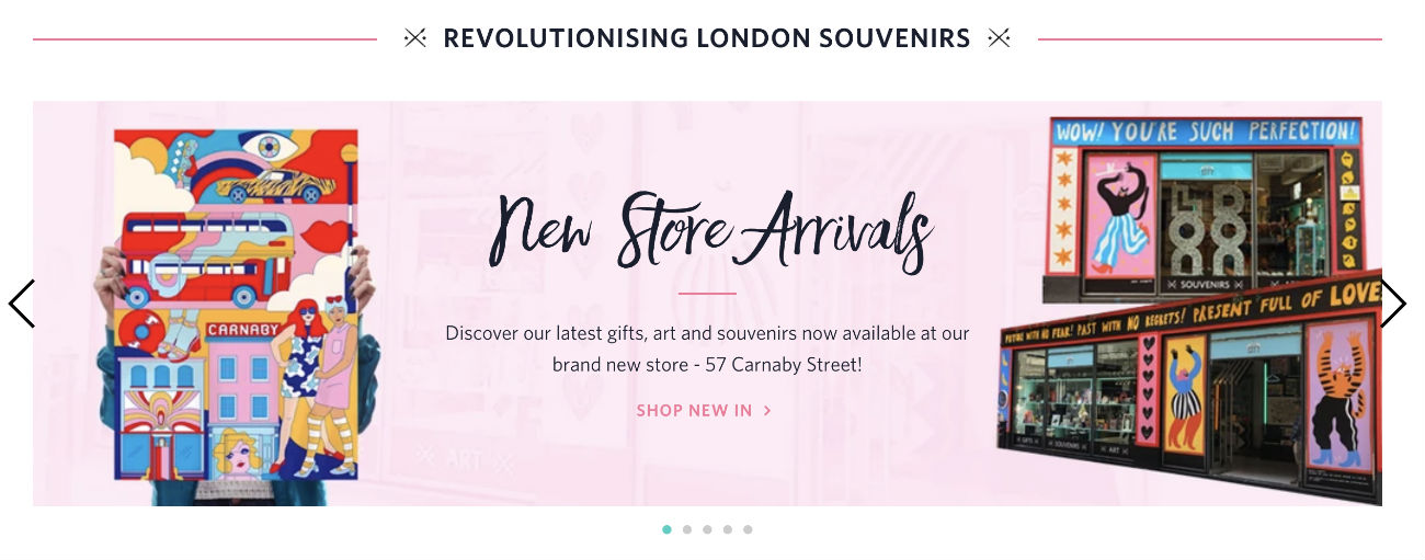 For inspiration, take a look at We Built This City, a London-based store that sells the works of local artists. On its homepage, WBTC has a banner promoting its new store arrivals.