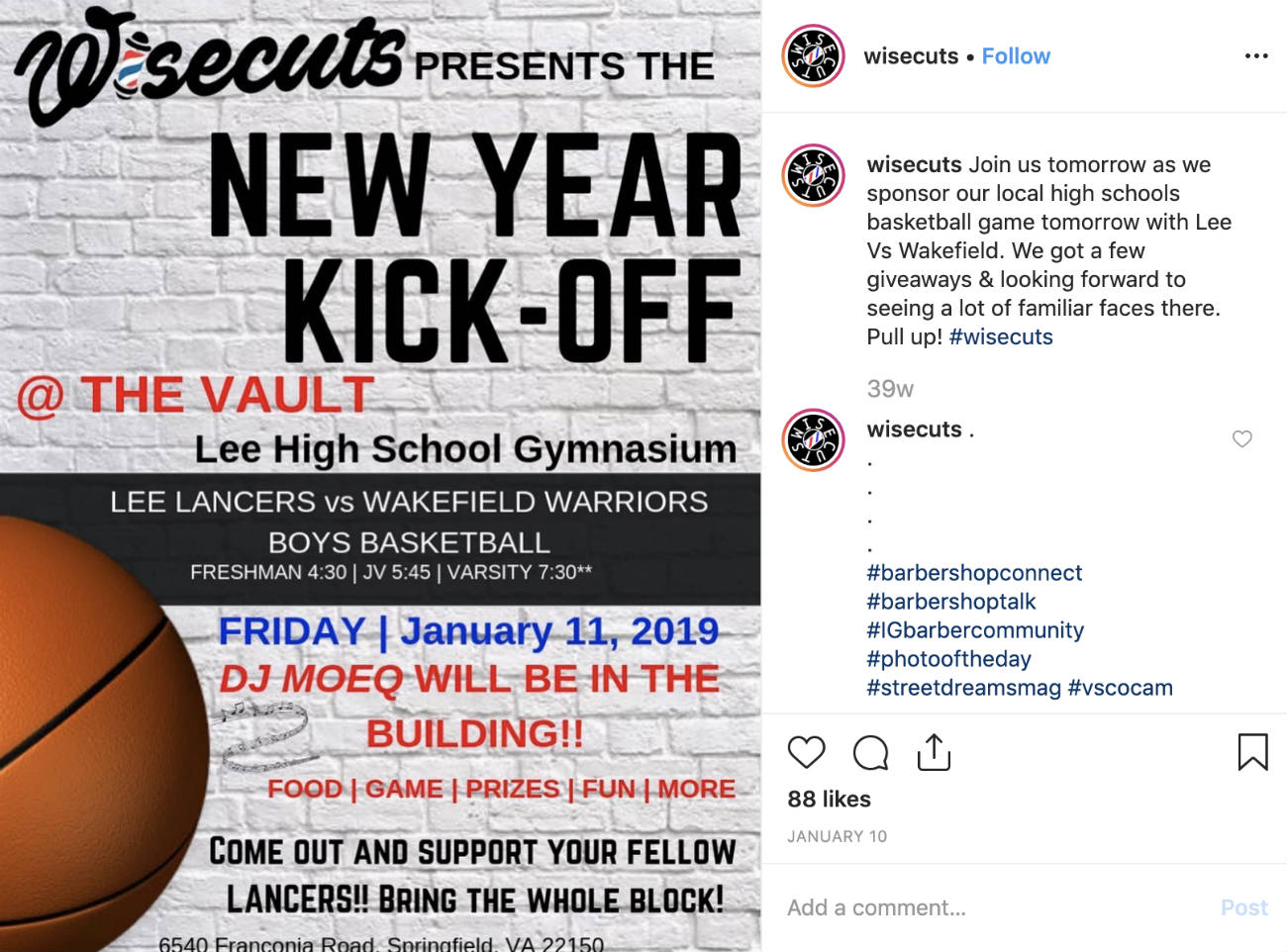 Here’s an example from Wisecuts Babershop, which sponsored a local high school event.