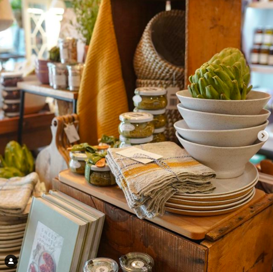 The Serendipity Gift Shop in California combines complementary items such as cookbooks, plates and bowls, baskets, towels, and jars of spread, all tied in with fresh artichokes used as décor.