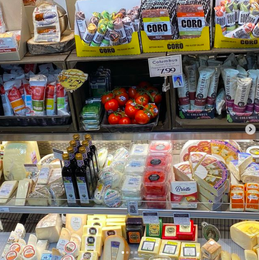 This image from the Western Market grocery store in Michigan features two separate examples of cross-merchandising: while the tomatoes, basil, and balsamic vinegar displayed near mozzarella encourage customers to build their own Caprese salad, the sliced watermelon displayed next to feta cheese serve as a healthy grab-and-go snack option.