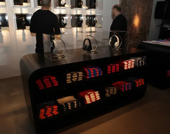 This example comes from the now-closed electronics store Beats by Dre in New York. By displaying clothing that includes the brand’s logo right underneath the headphones, the retailer allows fans to check out some merch while listening to beats.