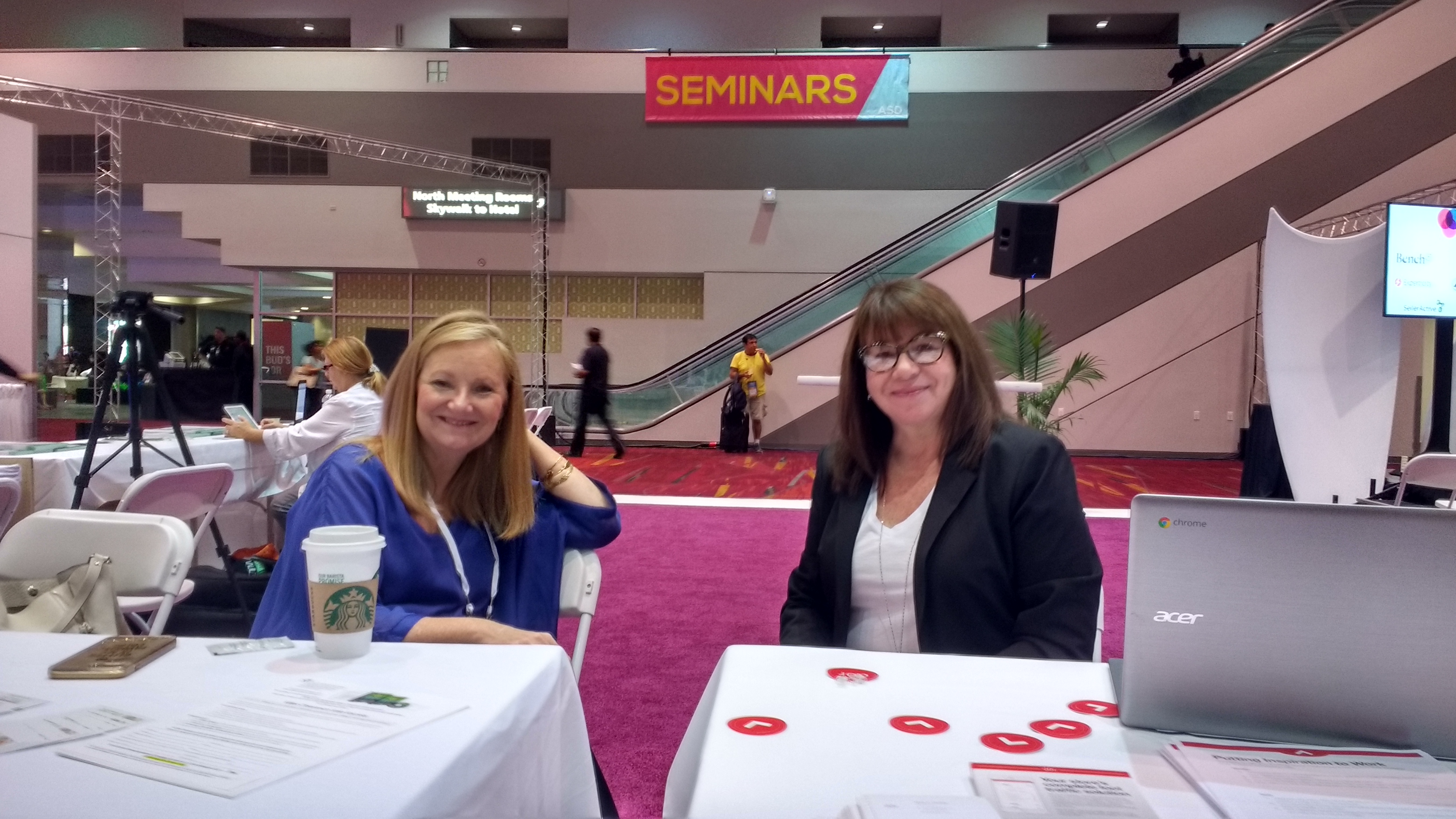 Retail superheroes Cathy Donovan Wagner and Georgeanne Bender debrief at the Retail Mavens table as the IRC winds down on its last day, probably discussing how to take over the world.