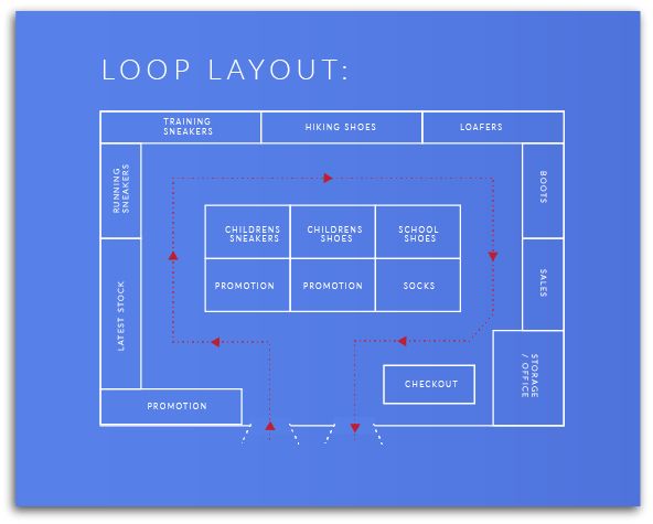 The loop layout allows you to give maximum efficiency to your store while looping the customers in. It gives you more access to influence the customer to your brand story, and of course, you should make sure to end the story with the happy ending known as the cashier.